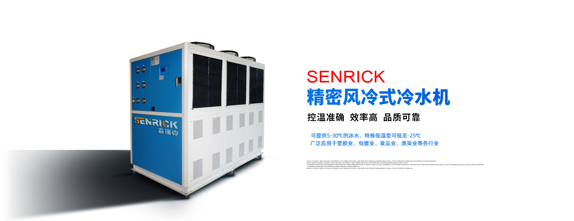 森瑞克機械(蘇州)有限公司(簡稱:SENRICK)是一家中外合作性企業(yè),引進技術(shù),專注于工業(yè)制冷設(shè)備,工業(yè)溫控設(shè)備,非標(biāo)制冷設(shè)備,集激光,化工,真空設(shè)備輔機等集研發(fā)、生產(chǎn)、銷售、服務(wù)于一體的的現(xiàn)代化科技企業(yè)。公司擁有完善的制造設(shè)備,先進的檢測系統(tǒng),獨立的加工、生產(chǎn)工藝,一支開拓創(chuàng)新專業(yè)有素的技術(shù)人才團隊,以及全面的質(zhì)量控制體系,為產(chǎn)品質(zhì)量的不斷優(yōu)化提供了強大的保障,以確保滿足不同市場的各種需求。經(jīng)過多年的努力企業(yè)相繼研發(fā)生產(chǎn)出了工業(yè)冷水機,工業(yè)冷風(fēng)機,工業(yè)冷油機,工業(yè)機,低溫冷水機,低溫冷風(fēng)機,低溫冷油機,螺桿式冷水機...